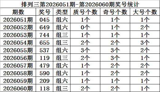 上期回顾:排列三第2026060期开奖:118,质合比为2:1,奇偶比为1:2,大小比为2:1。
